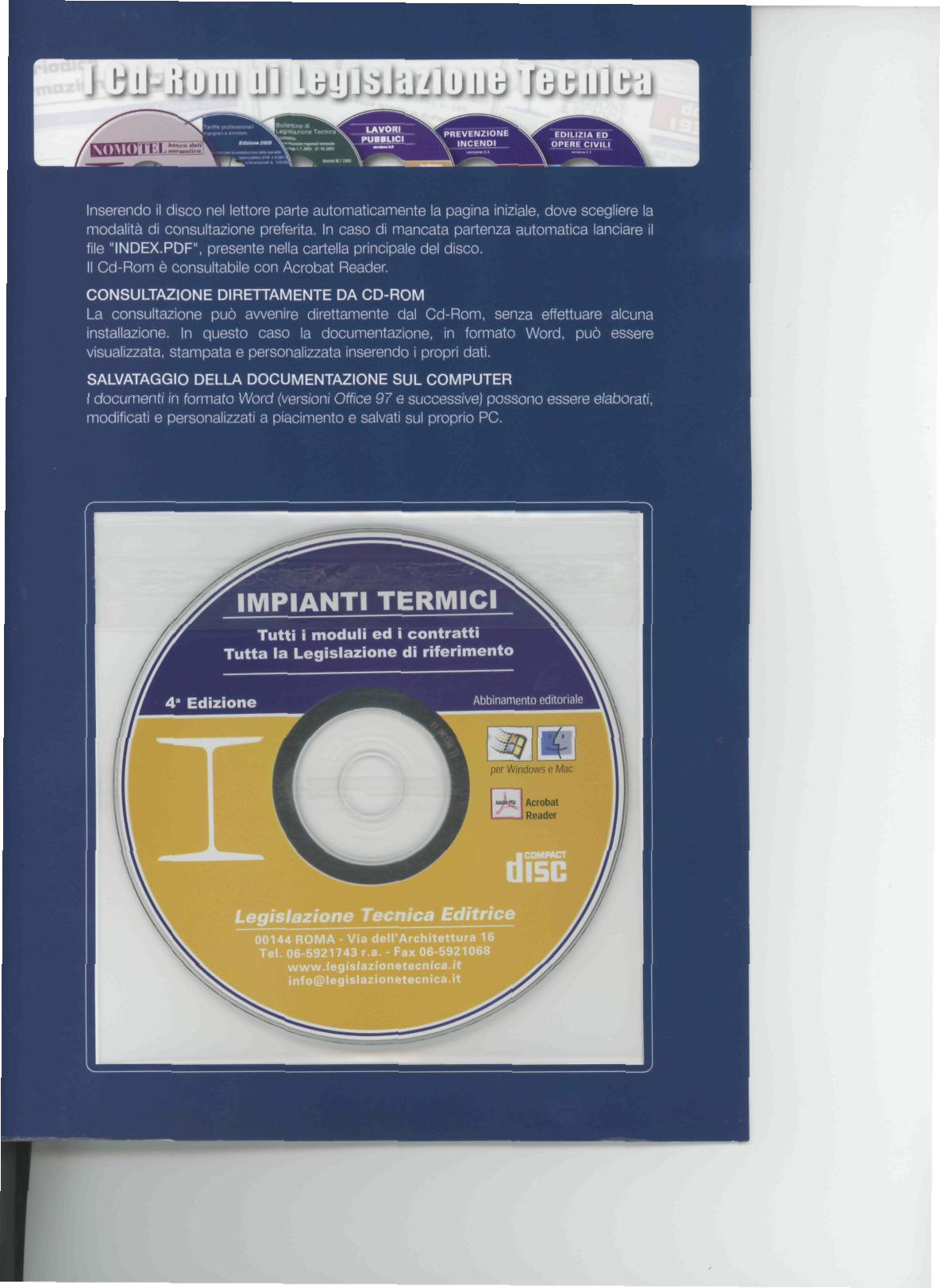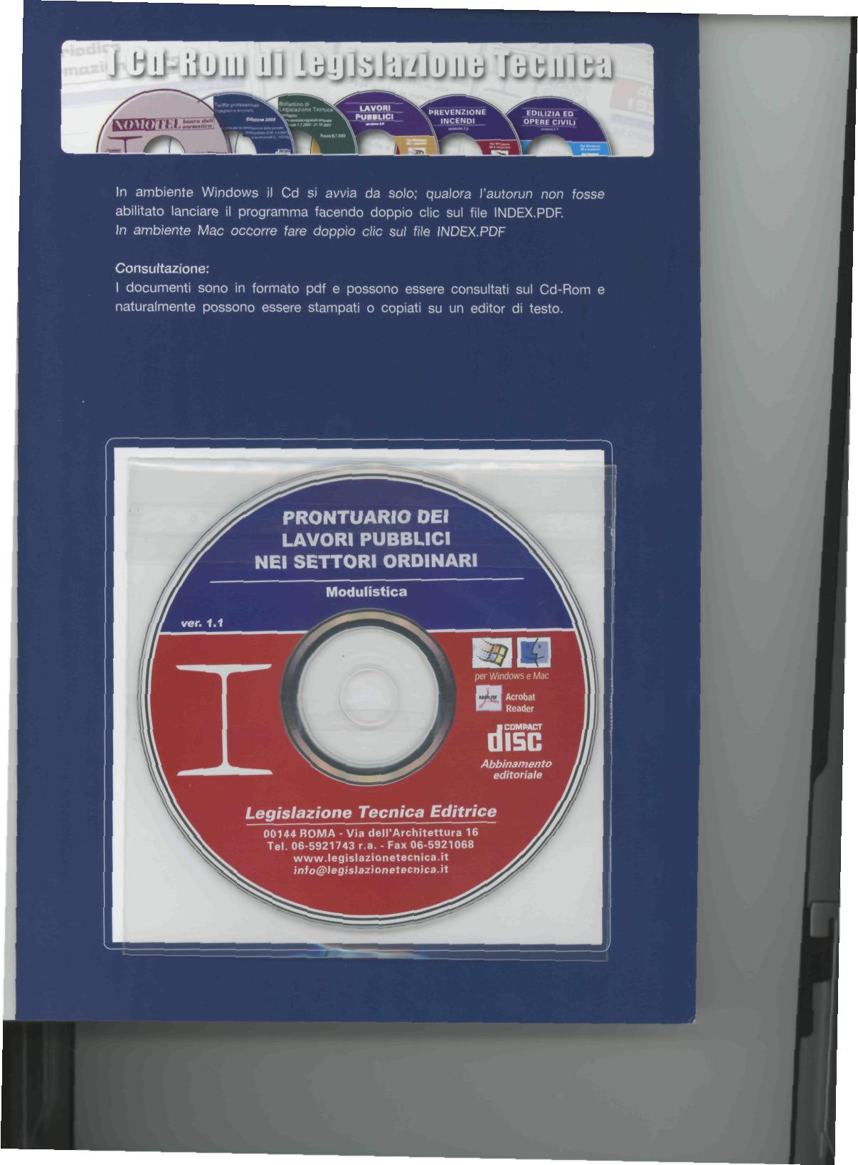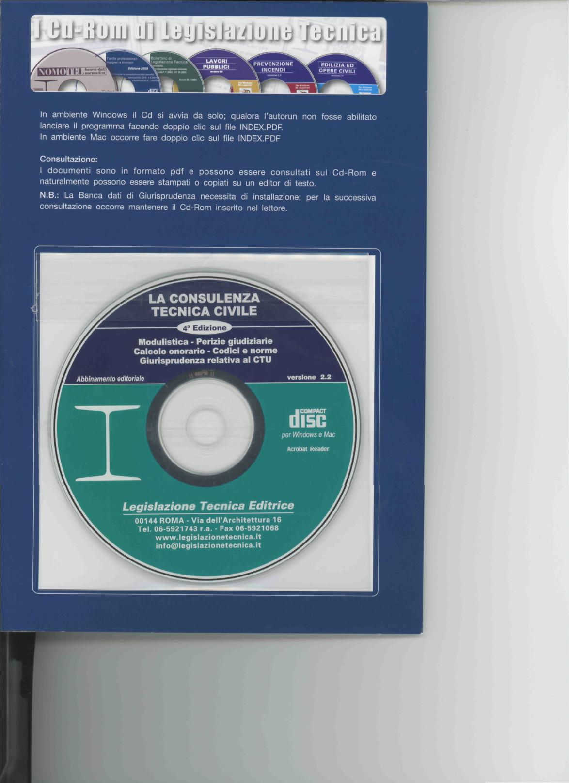 Il Cd-Rom allegato, liberamente personalizzabile dall'utente, contiene la modulistica necessaria per lo svolgimento dell'incarico di CTU, fogli di calcolo che permettono la determinazione degli onorar! e la quantificazione delle spese, i testi completi di molte perizie svolte ed infine una banca dati di sentenze di giurisprudenza riguardanti l'attività del Consulente Tecnico; tutti i files non hanno alcuna protezione e possono essere liberamente personalizzati dall'utente.